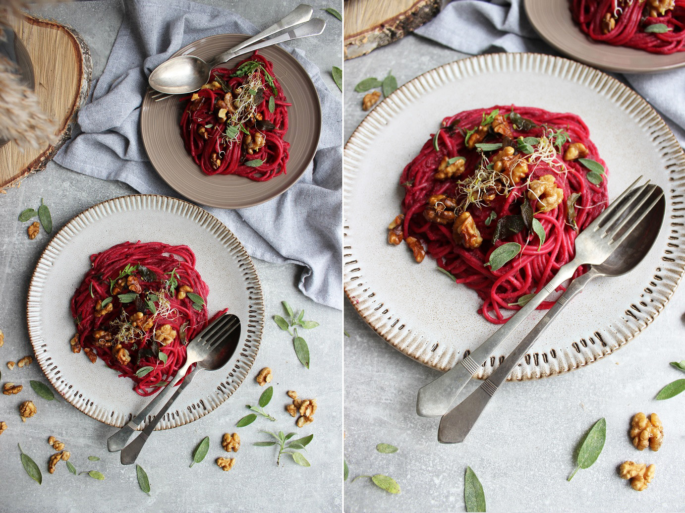 Ale tyto špagety s řepovou omáčkou, šalvějí a vlašskými oříšky mi přišly zajímavé, byť to taky není žádná kombinace, kterou jste asi ještě nepotkali. Šalvěj, vlašské ořechy a červená řepa k sobě prostě jdou. Pokud netrváte na vegan verzi, skvěle se k této omáčce hodí kozí sýr, niva nebo třeba i parmazán...